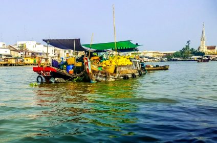 Early morning floating wholesale market on the Mekhong River with local fruit and vegetable vendors. The floating market is almost gone, but it is still worth seeing the local life and nearby landscapes in the Mekong Delta, with the closest floating market next to Ho Chi Minh City.