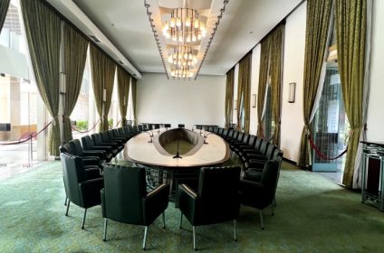 Architect Ngo Viet Thu designed the palace to convey key principles of Eastern philosophy as well as the integration of traditional and modern styles. Such attention inhabits everything, from the palace’s exterior to the furniture inside. The palace layout forms the Chinese character for “fortunate” or “auspicious”. The Room for Diplomatic Credential Presentation is considered the heart of the palace.
